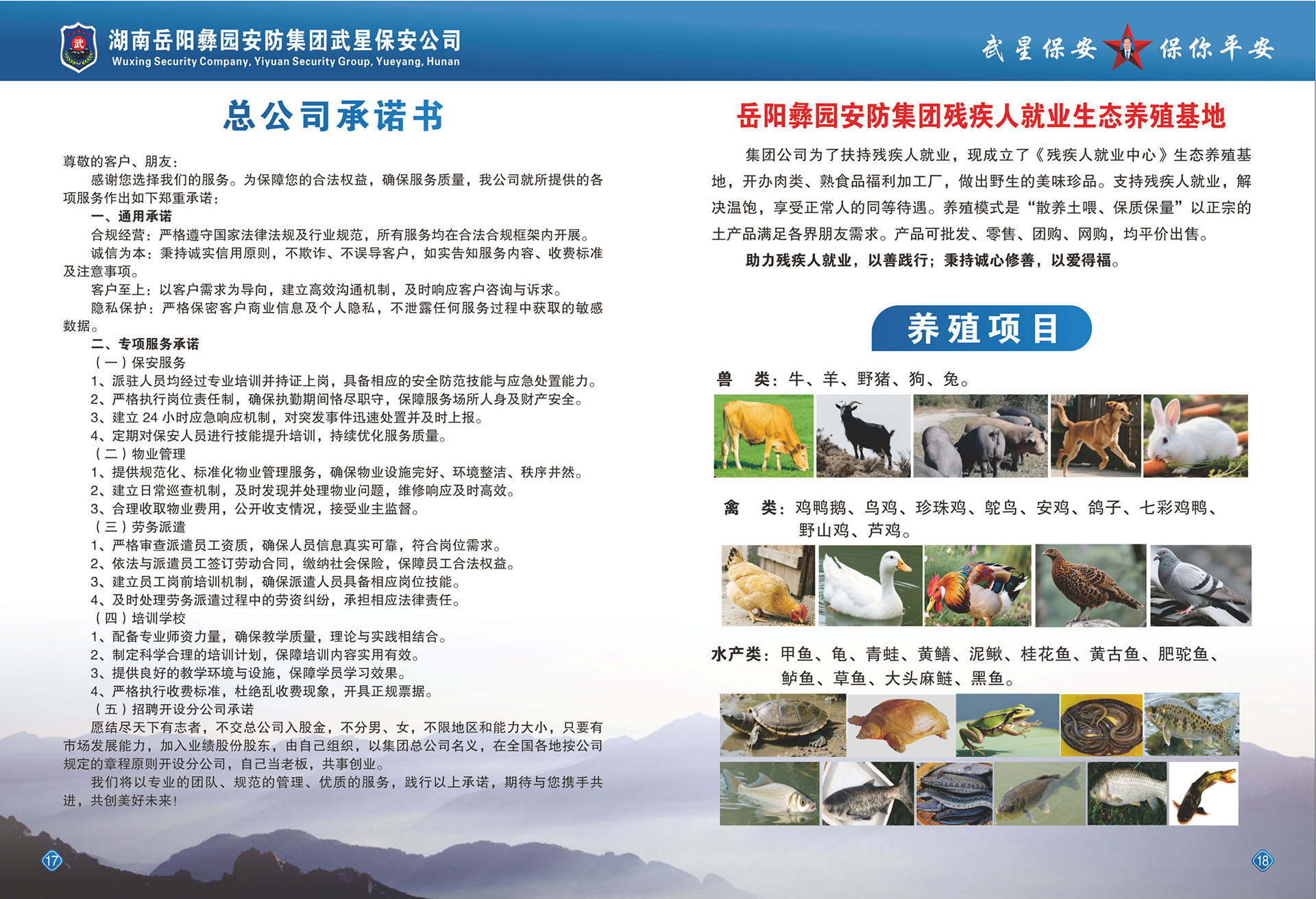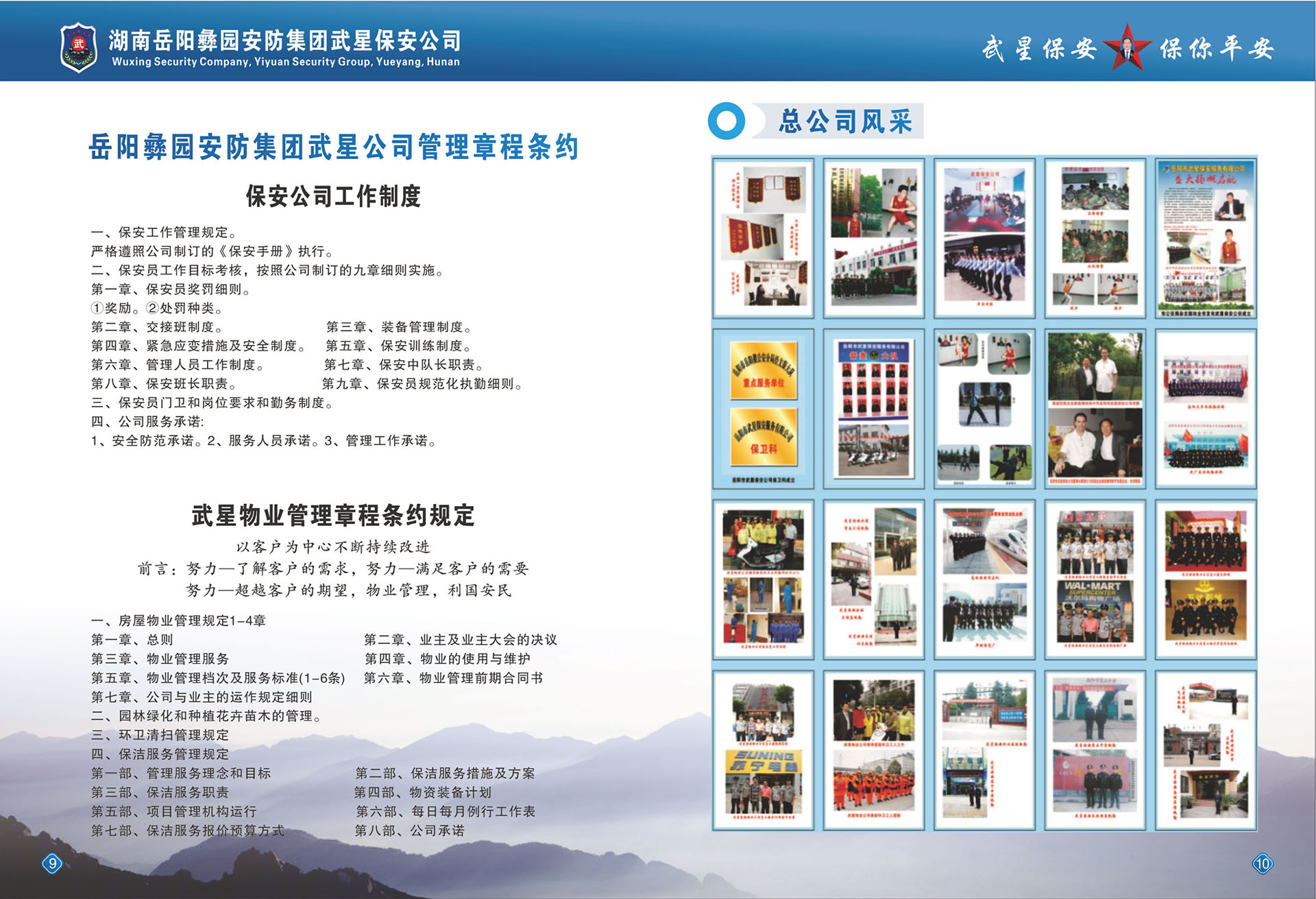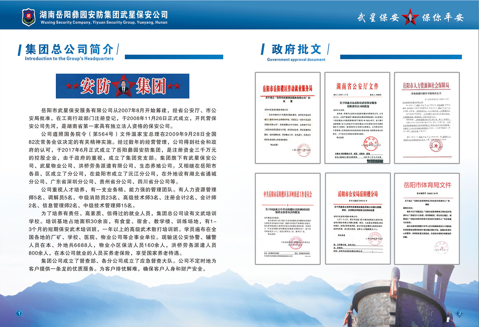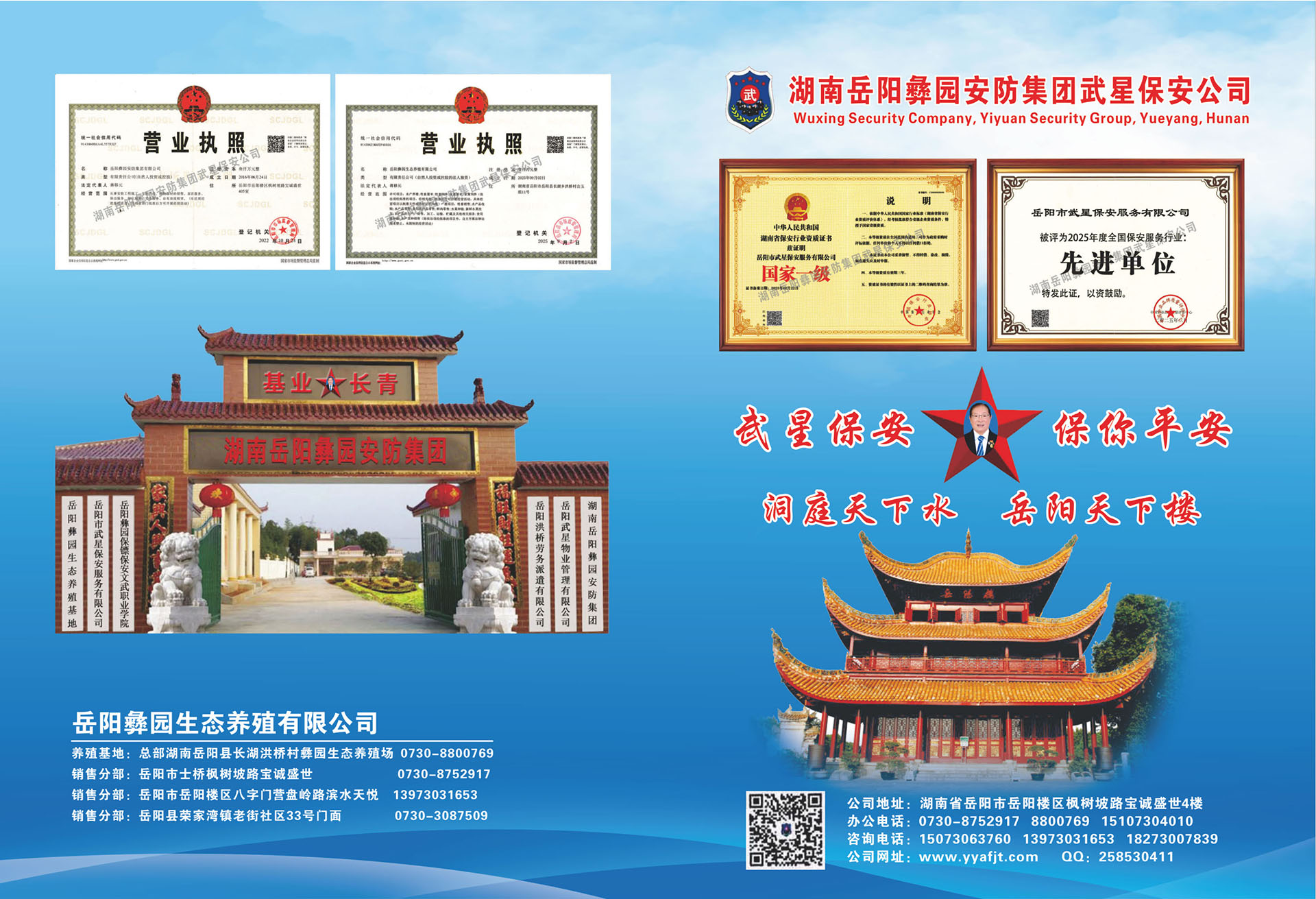 2017年6月正式成立了《岳陽(yáng)彝園安防集團(tuán)》,下設(shè)《武星保安公司》、《武星物業(yè)公司》、《洪橋勞務(wù)派遺公司》、《保鏢保安武術(shù)職業(yè)培訓(xùn)學(xué)?!返茸庸?/p>